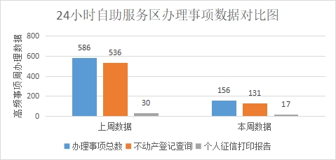 据统计,24小时自助服务区办理事项156件,其中:不动产登记信息查询打印131件,个人征信报告查询打印17件,社保查询打印4件,公积金查询4件。