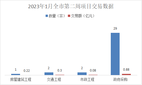 本周完成房屋建筑工程类交易1宗,交易金额0.22亿元;交通工程类交易2宗,交易金额0.30亿元;市政工程类交易2宗,交易金额0.08亿元;政府采购项目类交易29宗,交易金额0.88亿元。