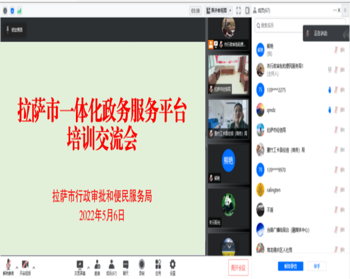 为深入贯彻落实国务院《关于加快推进政务服务标准化规范化便利化的指导意见》有关要求,推动形成标准统一、管理规范、运行高效、上下联动、便民利企的网上政务服务体系,5月6日,市行政审批和便民服务局在拉萨三级政务服务大厅组织开展全市一体化政务服务平台培训交流会。此次培训采取“线上+线下”相结合的方式进行,共180余人次参加。
