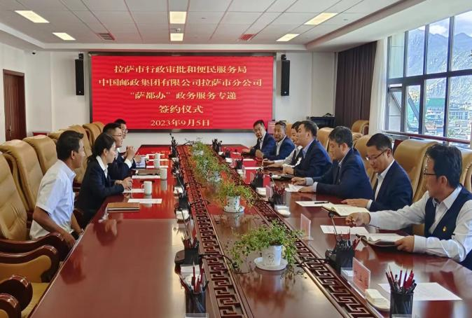 为有效推进企业群众办事“最多跑一次”,打通政务服务“最后一公里”,我局积极对接邮政公司,倾力打造“萨都办”政务服务专递。9月5日,拉萨市行政审批和便民服务局与中国邮政集团有限公司拉萨市分公司签订“政邮合作”战略协议,开启政务服务与邮政合作新篇章,助力全市政务服务再上新台阶。市行政审批和便民服务局党组副书记、局长贾延杰,中国邮政集团有限公司拉萨市分公司党组书记、总经理郑建华出席签约仪式。