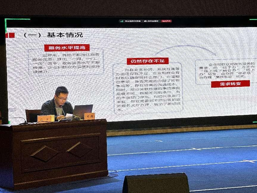 刘朋同志以“北京市推进‘高效办成一件事’‘三送服务’工作情况介绍”为主题,详细讲解了北京市坚持顶层设计,强化高位推动,注重全流程闭环管理建立职责清晰、协同高效、实施有力的改革工作推进机制,贯通场景动议、建设、试运行、常态化运行等全环节,同时提出通过无感监测、评估等方式,不断优化建成场景,强化“高效办成一件事”改革的可持续性,推动水电气网协同报装、出国留学公证、跨境贸易等62个“高效办成一件事”集成办事场景相关工作经验。